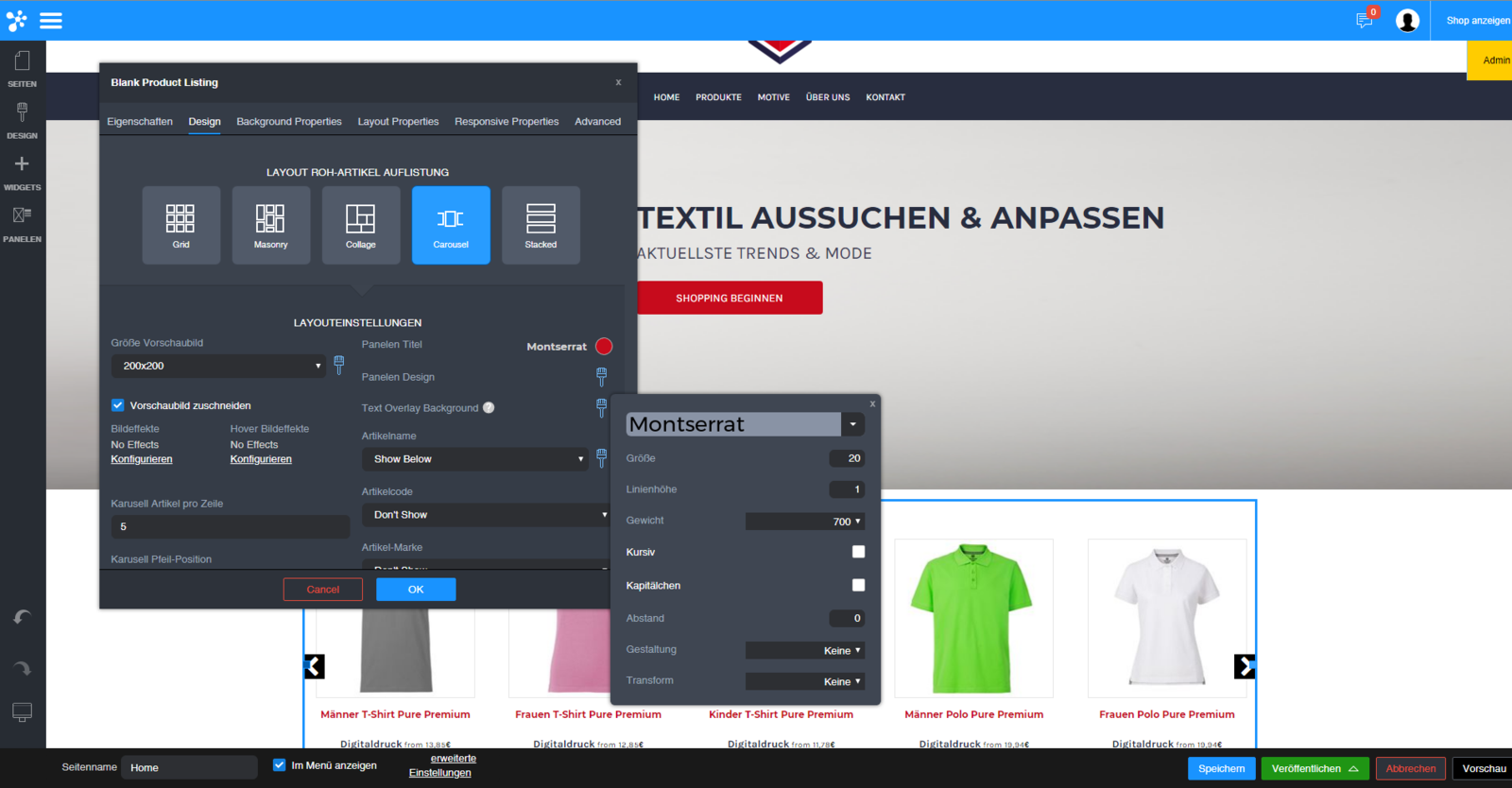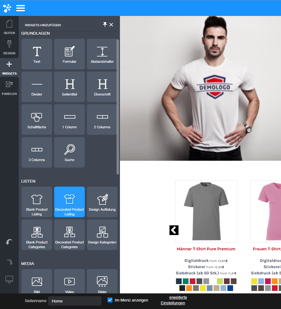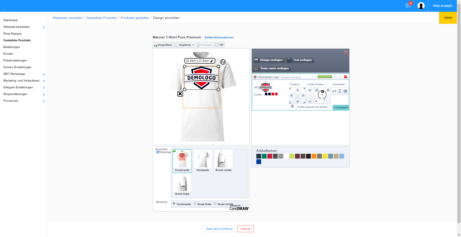 Über die Sidebar haben Sie Zugriff alle weiteren wichtigen Funktionen Ihres Backends, wie den Website-Editor, ihre Shop-Designs, Vorkonfigurierte Produkte, Bestellungen, Kunden, Preisoptionen sowie weitere Einstellungen.